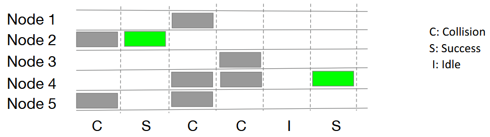 In slotted ALOHA, time is discretised and frames can only be transmitted only at the beginning of a time slot. All slots are the same size. Nodes are synchronised. If nodes transmit concurrently in a single slot, the collision is detected by all nodes. When node has a new frame to send, it transmits in the next slot. With no collision, we have a success! But with a collision, each node will retransmit the frame in each subsequent slow with a probability until success. This allows a probabilistic avoidance of conflicts (much like Raft election timeouts).