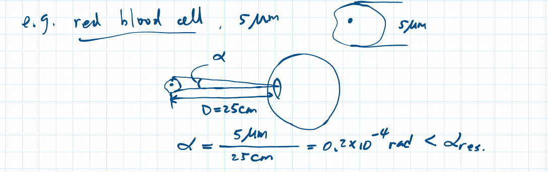 however, we still can’t see a red blood cell. it’s not the size of the object (or size of the image), but the angle subtended by the object that matters!