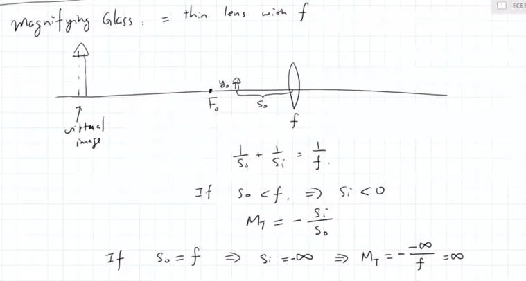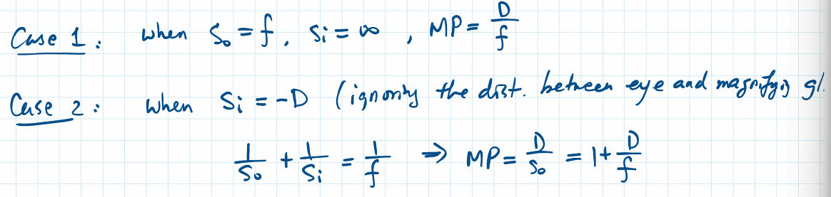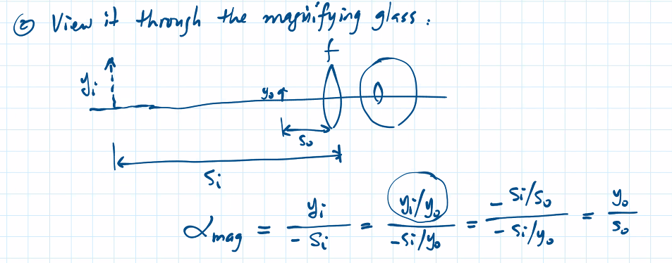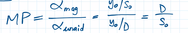 We define the magnifying power (MP) as the ratio of the magnified angle to the unaided angle. Note that the MP is different from the transverse magnification.