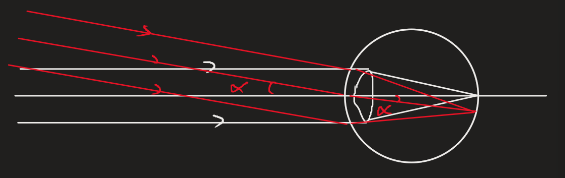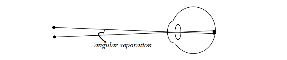 Note that the ray passing through the optical centre has the same angle . If the two points fall on two different photoreceptive cells, then they can be resolved by the sensor (our retina). Otherwise, we can’t resolve it.