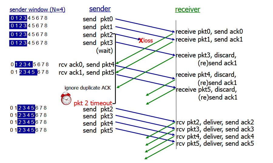 The key problem with GBN is that we can’t get high utilisation without a similarly high window size. Because many packets have to be retransmitted, it’s also inefficient on long-haul transmission links with a high bandwidth.
