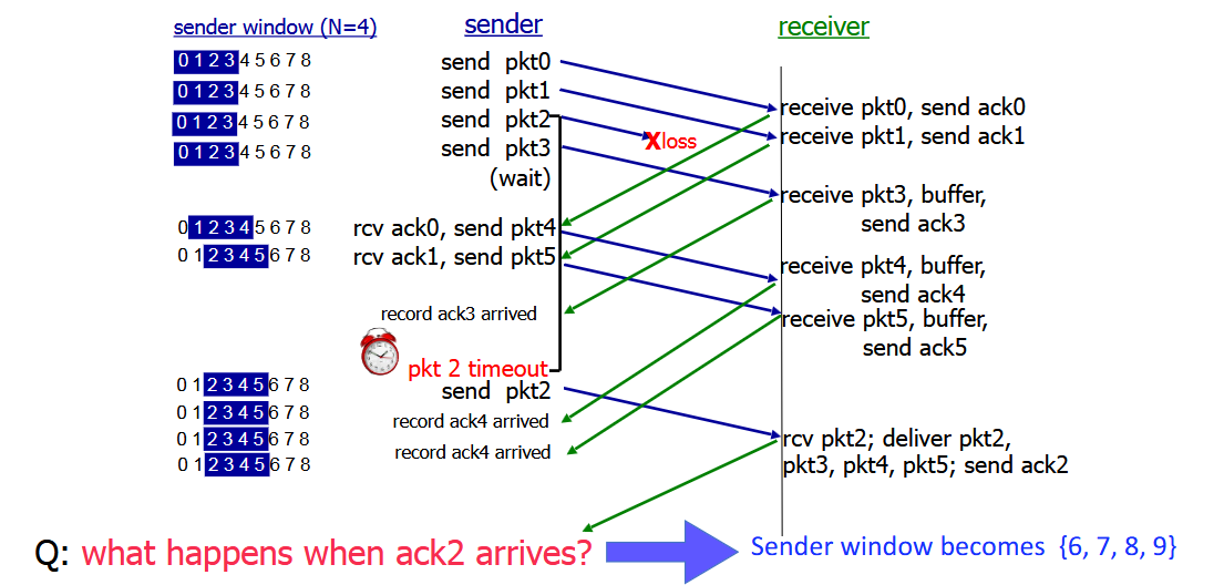The receiver then must individually acknowledge all correctly received packets. It will buffer packets as needed, for eventual in-order delivery to upper layer.