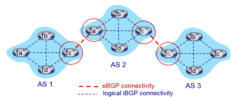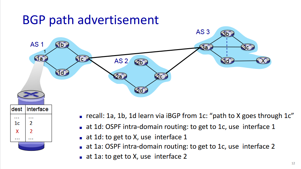 ASw, X(whereXis a router) via eBGP. - If the policy is to accept it, then the gateway router propagates (via iBGP) to all of its intra-AS routers. So all internal routers find out about this path.