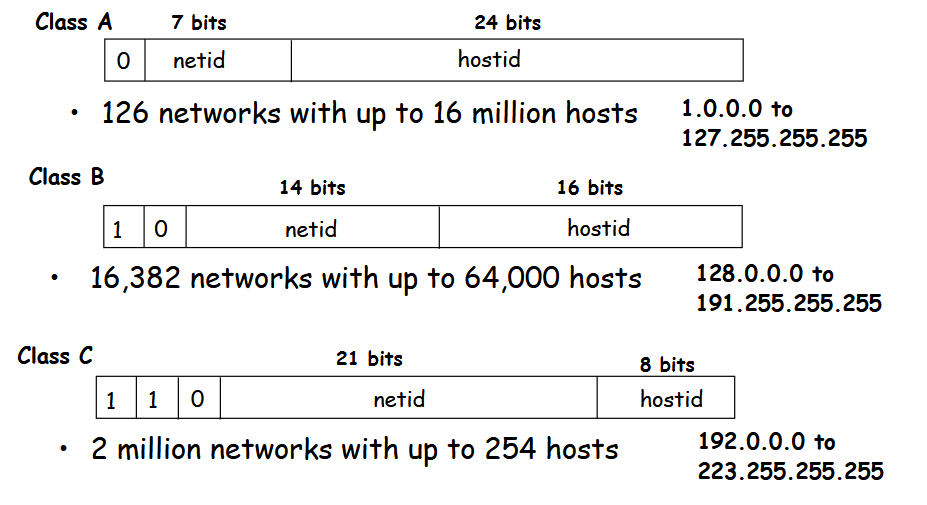 - Class A allowed for 126 networks with up to 16 million hosts.