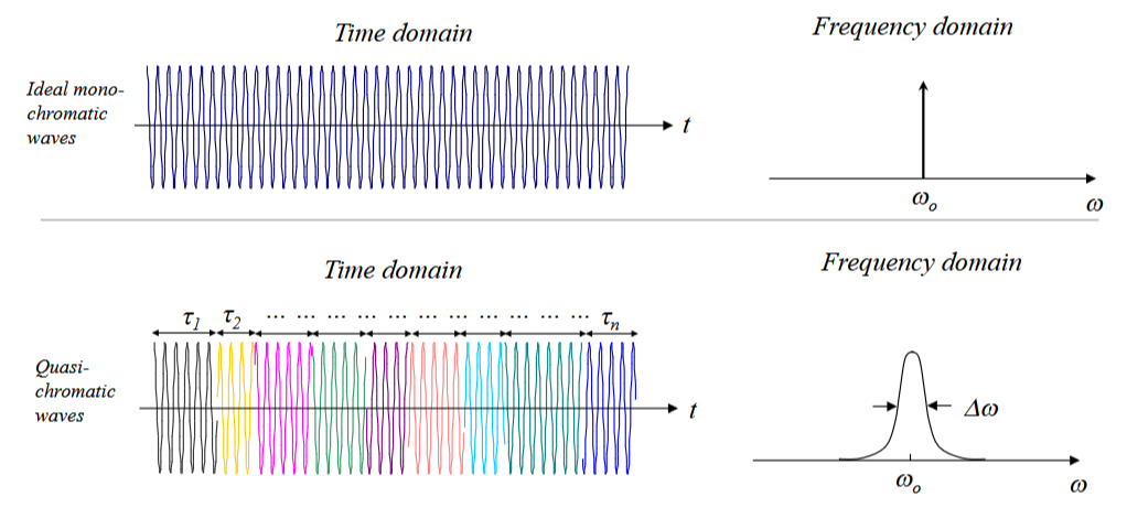 - Temporal coherence describes how monochromatic the light is (i.e., how precise its single wavelength is). In practice, sources have a narrow but finite spectral width.