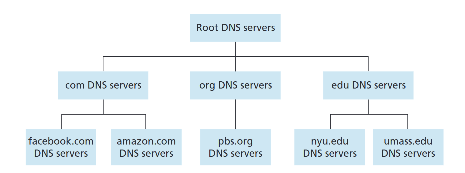 The Domain Name System (DNS) is a distributed database implemented in a hierarchy of DNS servers. It is described by an application layer protocol that allows hosts to query the distributed database to find the addresses given a domain name (i.e., en.wikipedia.org to an IP address).