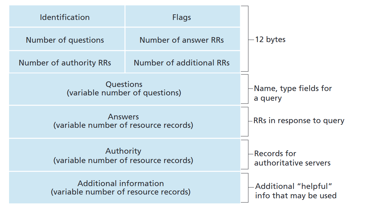 The DNS protocol defines query and reply messages, both with the same message format. A message consists of: