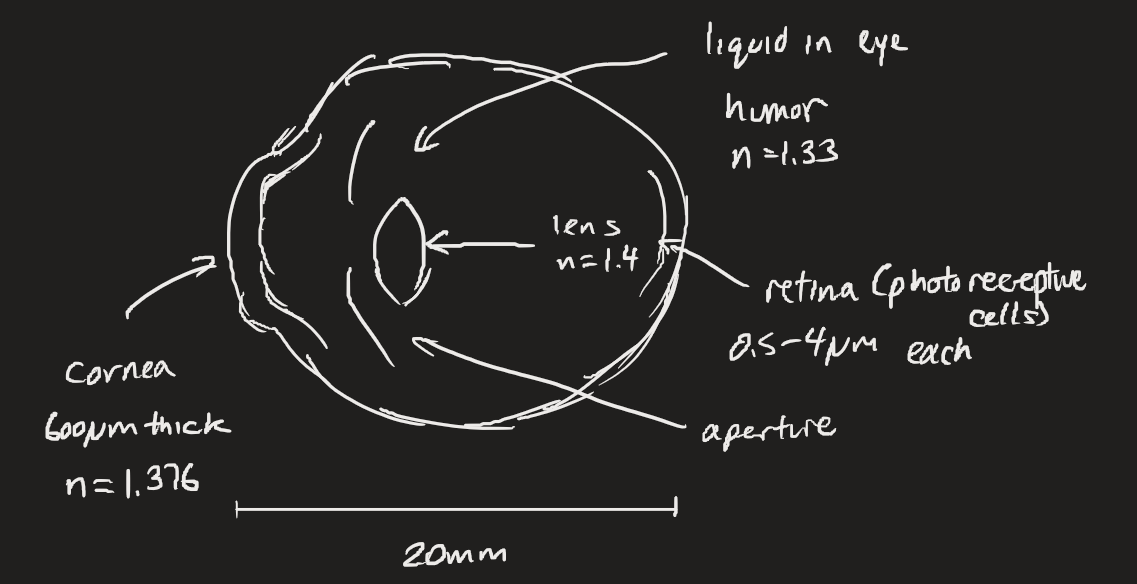- Object focal length — is around 12 mm. It varies as the eye accommodates, but not by too much.