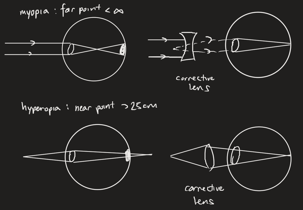 - Astigmatism — where the cornea is asymmetric, i.e., . We correct with cylindrical lenses.