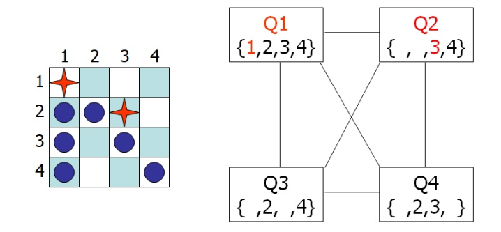 For example, take the 4-queens problem, where we begin the check in the image below. We prune and . So this means we must backtrack because there’s no possible assignment for from this partial assignment, called a domain wipe-out for .