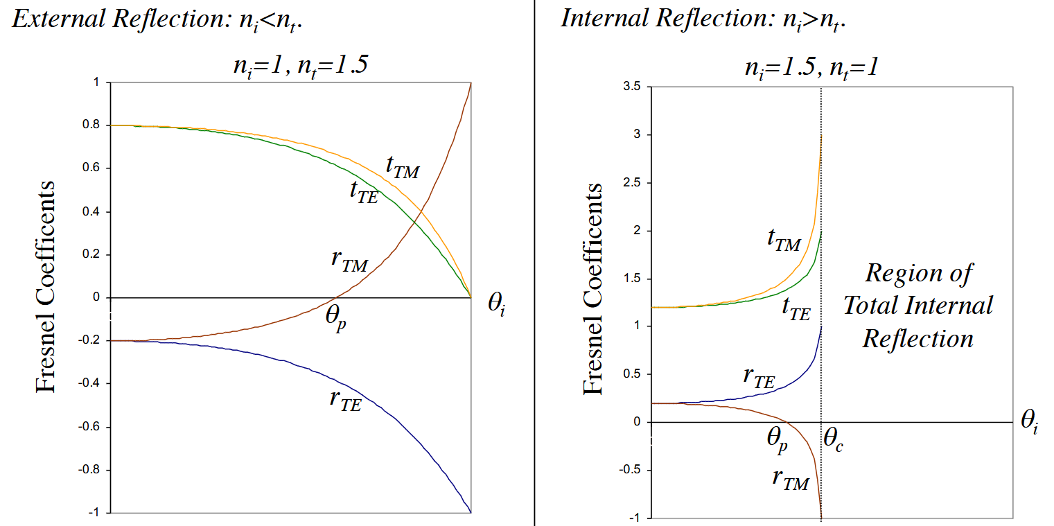 - is a crossover point called the Brewster angle. This has some physical significance: , so TM-polarised light is completely transmitted with no reflection.