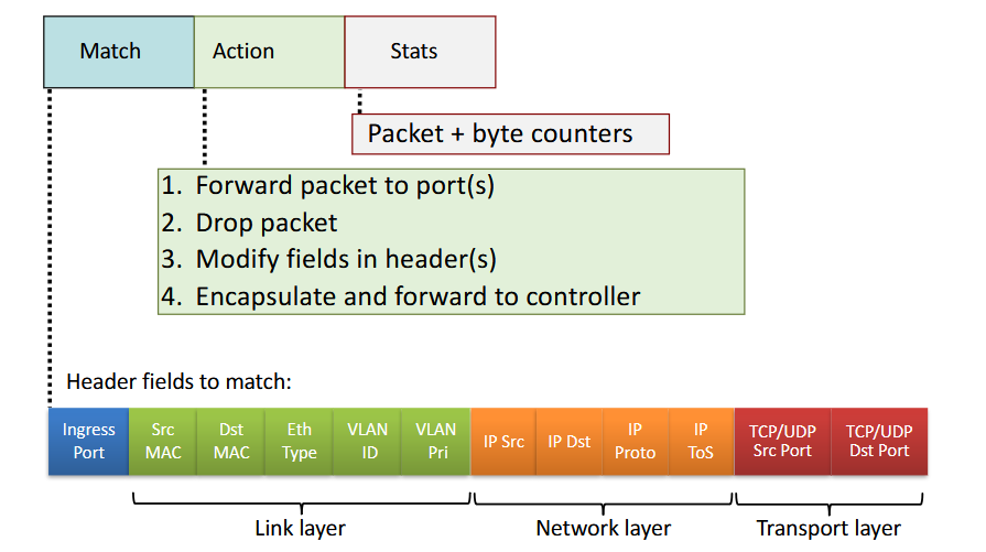 - Actions: for the matched packet, we drop, forward, modify, matched packet or send it to a controller.