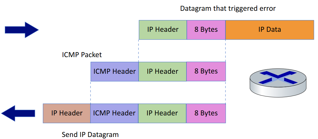 We’ll observe that ICMP doesn’t correct errors, it simply reports them. Error messages are always sent to the original source, because that’s the only metadata known in the datagram (source/destination addresses). ICMP uses the source IP address to send the error message to the source of the datagram.