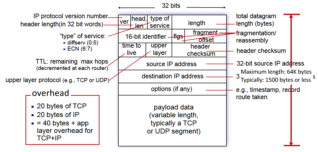 - TTL — decremented by 1 at each router. If the TTL is 0, then the packet must be dropped. This ensures that routers don’t loop around in the network forever.