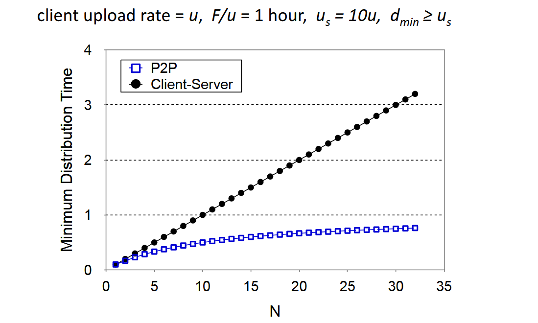 D\ge \max \left(\frac{nF}{u_s}, \frac{F}{d_\min}\right)In the P2P paradigm, we see similar bottlenecks. But an additional bottleneck is the time it takes to distribute each file copy to each client. Both the demand and the supply increase linearly by , since each peer brings us service capacity.
