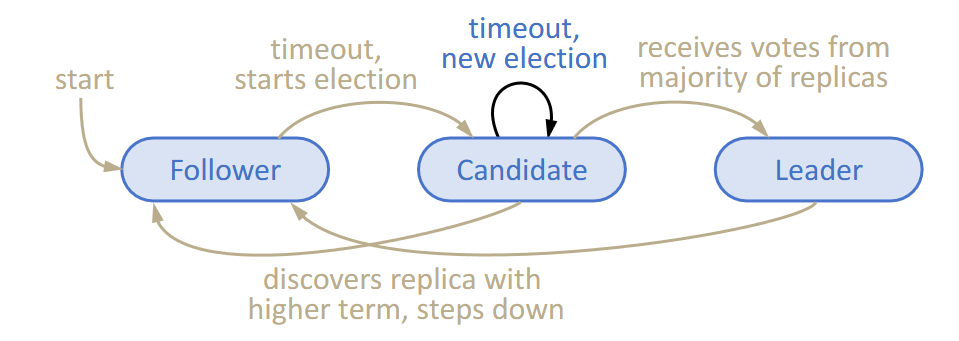 When the timer has timed out, the follower will transition to a candidate and initiate an election, with the assumption that the leader has crashed. It starts the election by incrementing the current term, changing its state, and voting for itself. Then, it sends a RequestVote RPC to all other replicas. There are three possible outcomes: