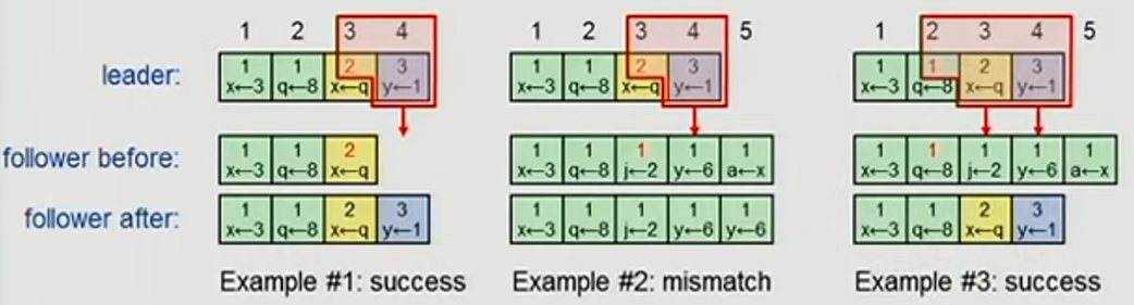 On each AppendEntries RPC, it should include the <index, term> of the entry (not the operation!) preceding the new one. The follower must contain the matching entry, otherwise it rejects the request. If a request is rejected, then the leader will send another previous entry further away (see examples 2/3) below. This is basically an induction step, and the core idea is that we don’t know where the divergence has occurred so we keep trying until we get something that works.
