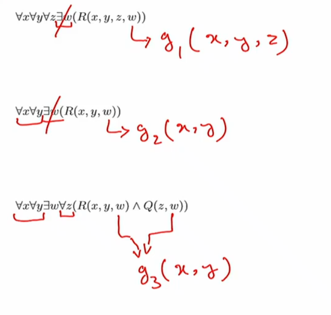 - add function symbols that mention every universally quantified variable that scopes the existential