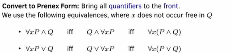 - Standardise variables. Here, we want to rename variables so that each quantified variable is unique. i.e., if two variables are named the same, but exist in non-conflicting scopes, then we should rename them such that they don’t conflict.