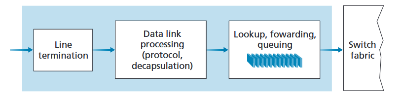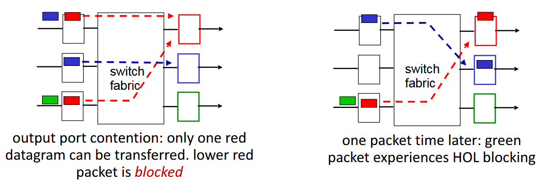 If the switching fabric than the input ports combined, then queueing may occur at input queues. This causes queueing delay and loss due to input buffer overflow. Another phenomenon is head-of-the-line (HOL) blocking. This happens when a queued datagram at the front of the queue prevents others in the queue from moving forward.