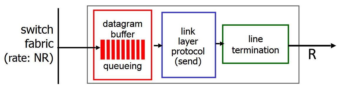 At the output port, buffering is required when datagrams arrive from the fabric faster than the link transmission rate. The switch fabric may deliver datagrams at a rate of (: number of inputs, : transmission rate).