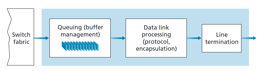 The output port is the analogue of the input port. See buffer management and scheduling.