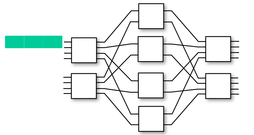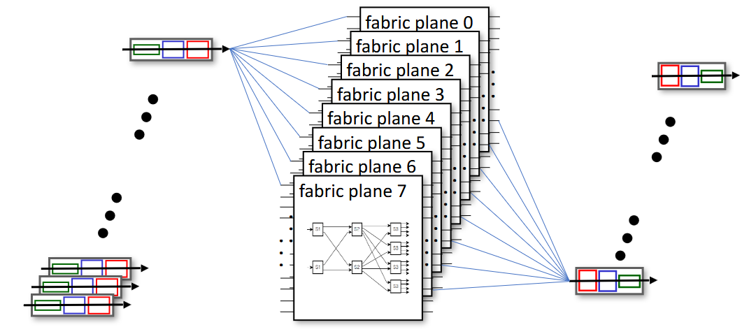 This can be scaled up even further. If we take the above as a single plane, then we can have multiple interconnection fabric planes. For example, the Cisco CRS router has 8 switching planes, each of which have a 3-stage interconnection network. This vastly improves the switching capacity.