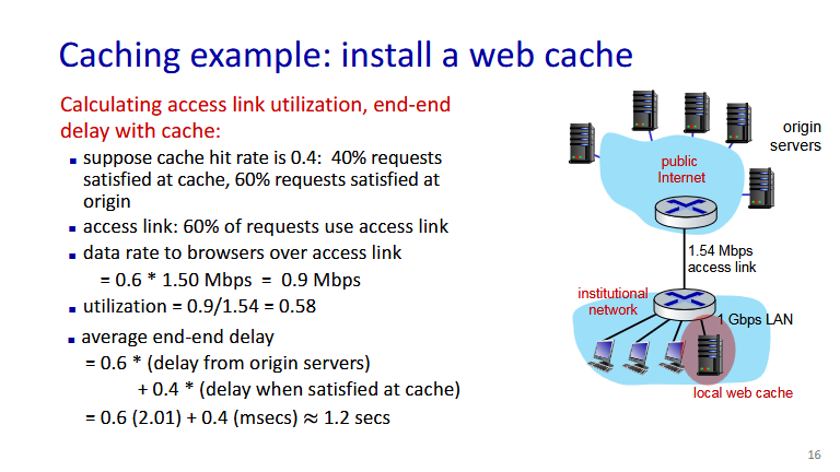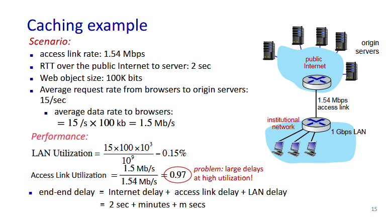 Access Link Utilisation = 1.5 Mb/s 154 Mb/s ≈ 0.01 end-to-end delay = internet delay + access link delay +LAN delay = 2 sec + m sec ≈ 2 sec Caching has a smaller end-end delay than
